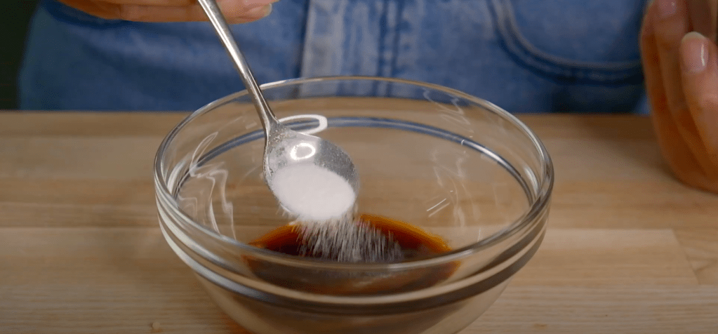 작은 그릇에 간장, 흰 설탕, 다시 가루, 물을 넣고 잘 섞어 설탕이 녹도록 합니다.